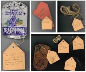 Each object has an attached tag bearing handwritten poetry in the form of instructions for how to utilize the object together with a bean. One can’s instructions reads: “Drop single bean on can while on flat surface. Repeat.” The instructions with the hinge read, “Place among Beans. Admire colors.” Some instructions encourage the user to make sounds: “Place bean on dish tip and shake quietly.” Some have instructions for a particular action, or to achieve a certain goal: “Drop buckle over bran. Keep trying to get into opening.” And some encourage further introspection or questioning, such as the instructions that accompany the key: “In what way is a key like a bean?” Or the shoe heel: “Place bean (white) on inside of heel (black). Consider contrast.”